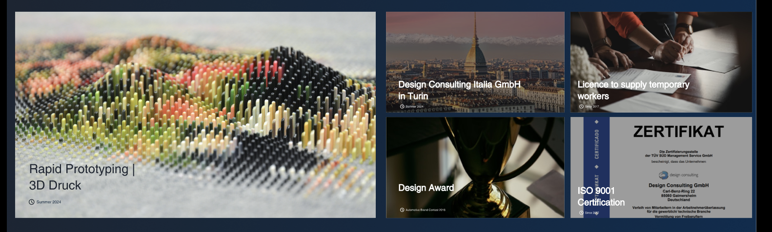 I’d like to reproduce the attached layout: on the left one large image, and on the right a 2×2 image grid (four tiles), each with a small text overlay (title + meta line) — please see the screenshot: http://neu2025.dc-gmbh.com/support/template.png