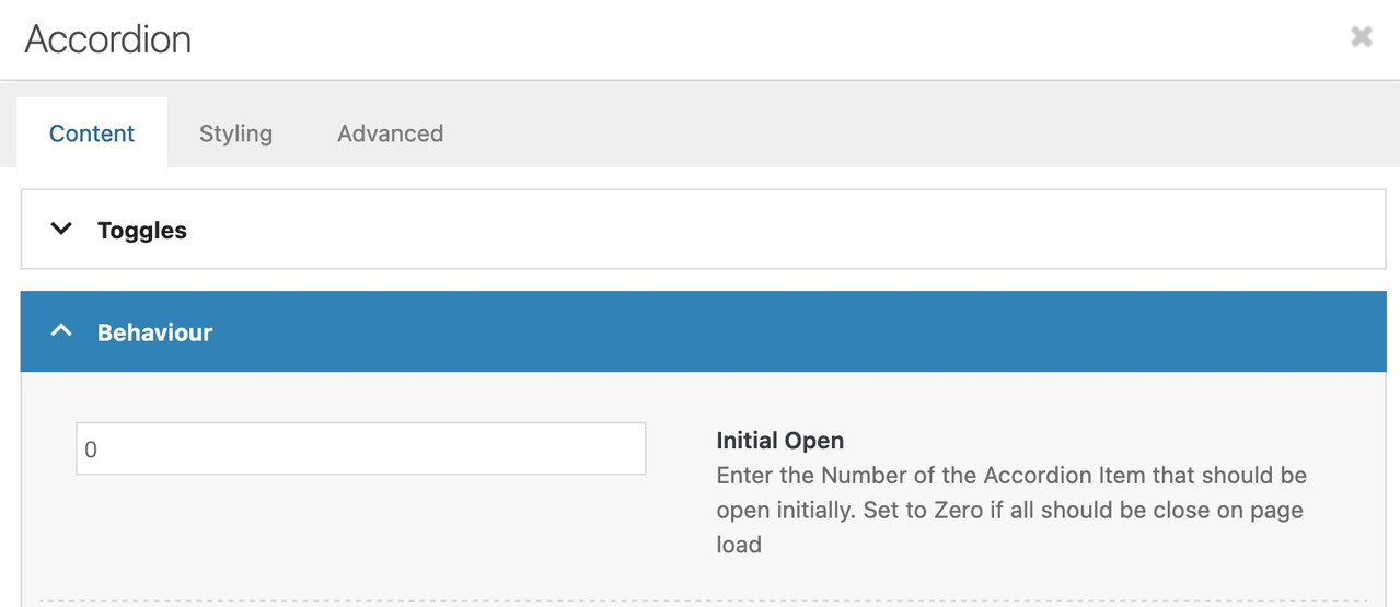We couldn’t find the page with the Accordion element on your site, so we created a test page and left the Initial Open setting at its default value (zero), as described. On this test page, we can see that the toggle element is not working correctly. Did you add any custom scripts or modifications to the theme? Please also try deactivating all plugins to check if this is a plugin conflict.