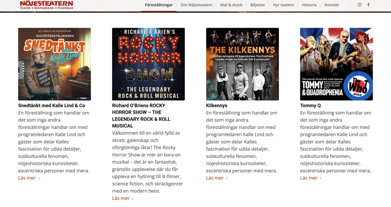 Only thing that remains is the Read More button (Läs mer). If the event has its own home page it should link there. For example Rocky Horror show. Read More button (Läs mer) should link to https://rockyhorror.se/