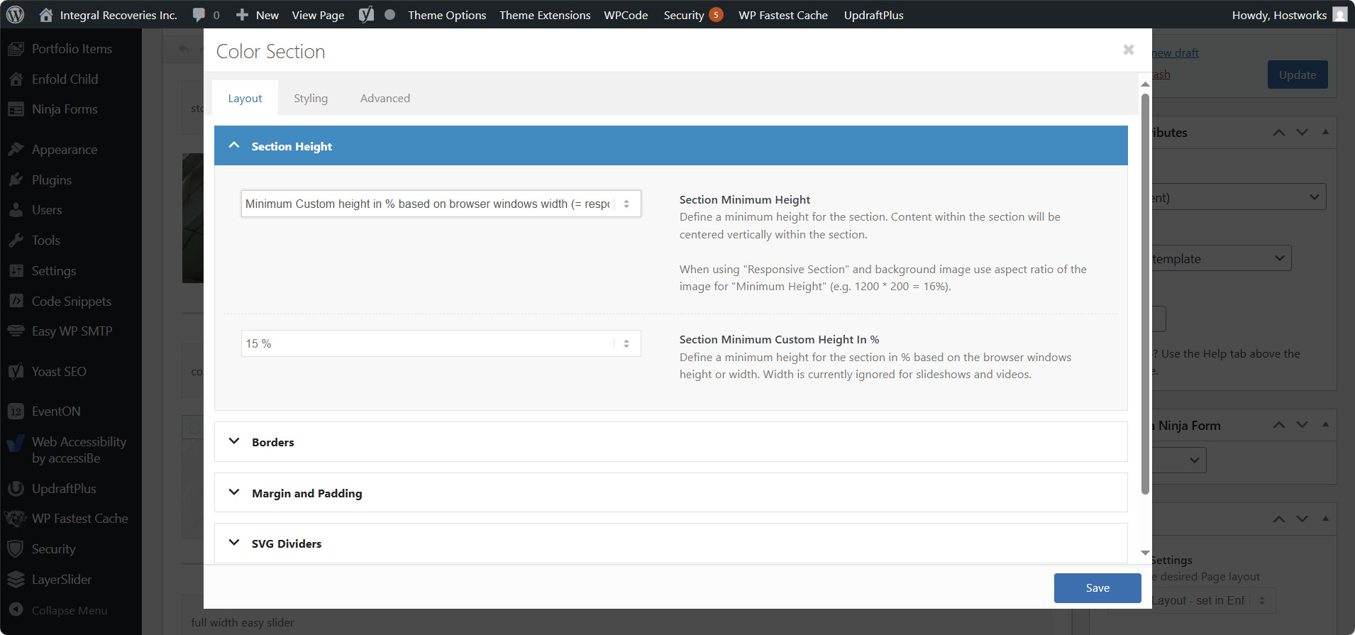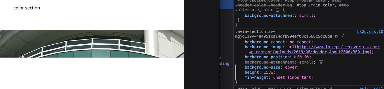 2) Color section – I’ve tried all options under Section Height including – Minimum Custom height in % based on browser windows width (responsive). However, it is not responsive (using 15% custom height for example). When you minimize for phone, it just blows up the left portion of the image height and does not adjust horizontally.